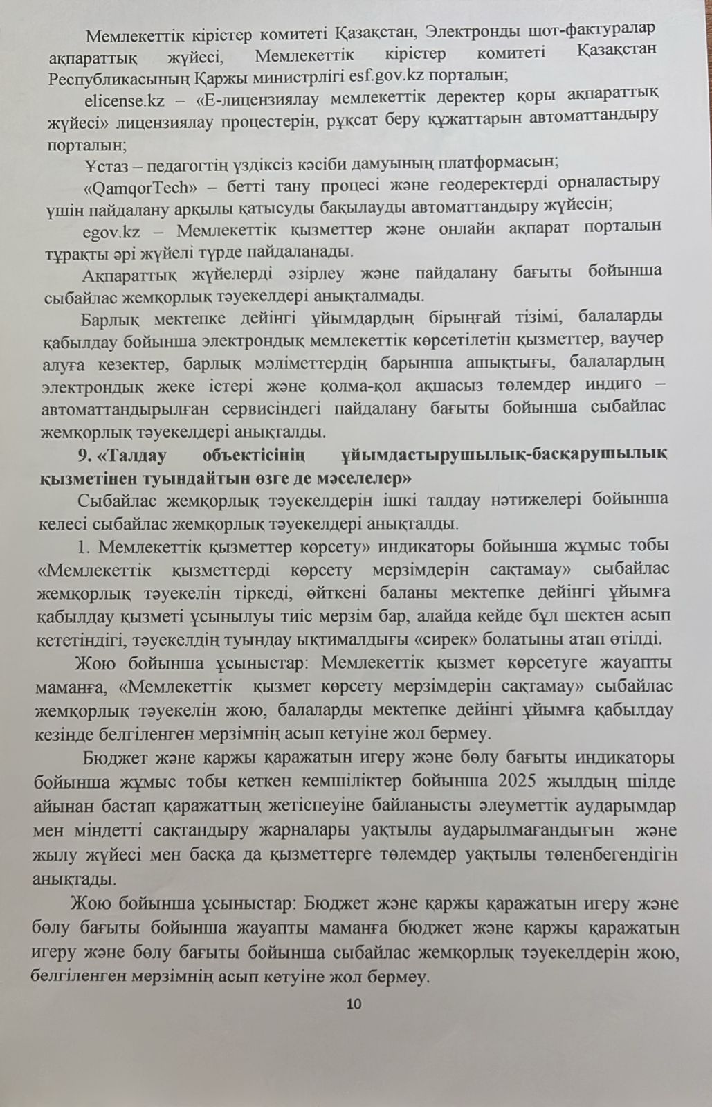Сыбайлас жемқорлық тәуекелдеріне ішкі талдау нәтижелері туралыталдамалық анықтама