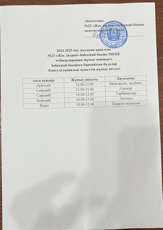 Консультациялық пункт жұмыс кестесі » №23 "Жас даурен"