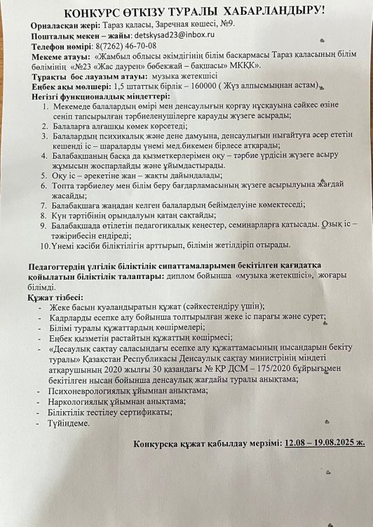 КОНКУРС ӨТКІЗУ ТУРАЛЫ ХАБАРЛАНДЫРУ! музыка жетекшісі 1,5 штаттық бірлік