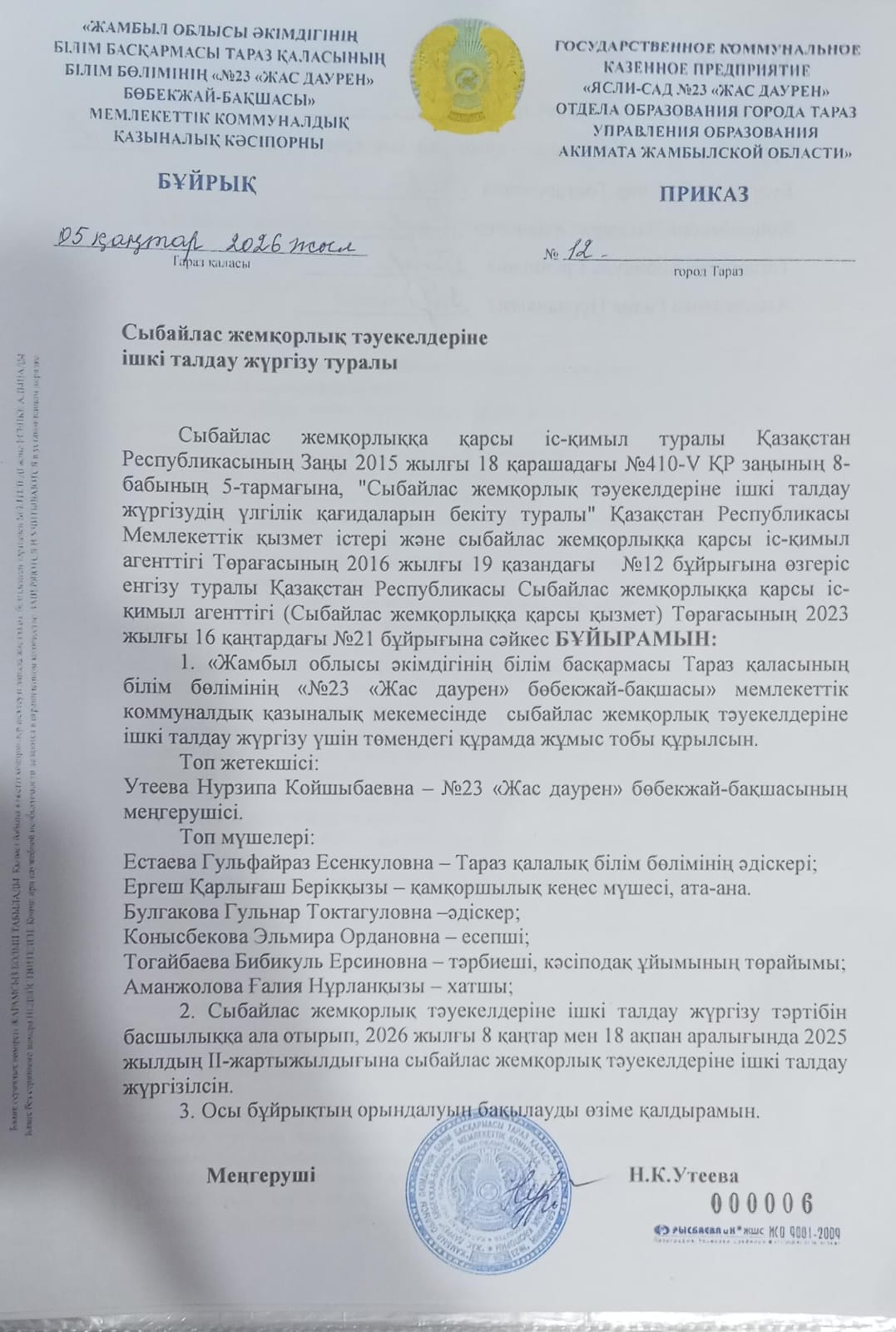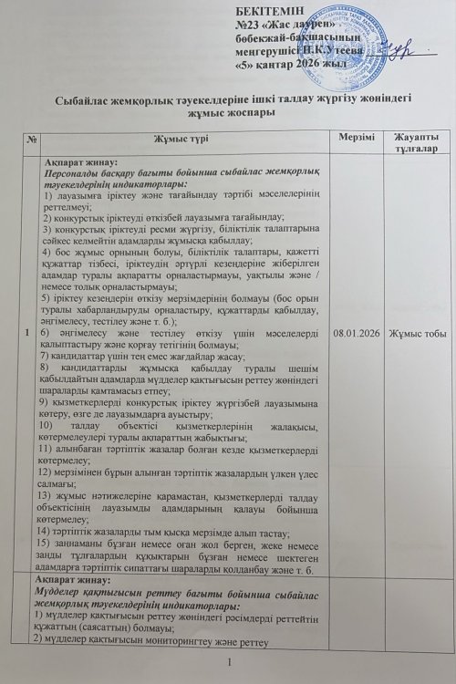 Сыбайлас жемқорлық тәуекелерін ішкі талдау жүргізу туралы » №23 "Жас даурен"
